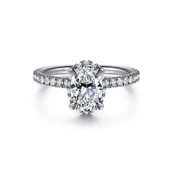 (903) 454-3802Suede - 14K White Gold Oval Hidden Halo Diamond and 1 7mm Shank 1 2 way around pave Shank *Setting only, center stone not included